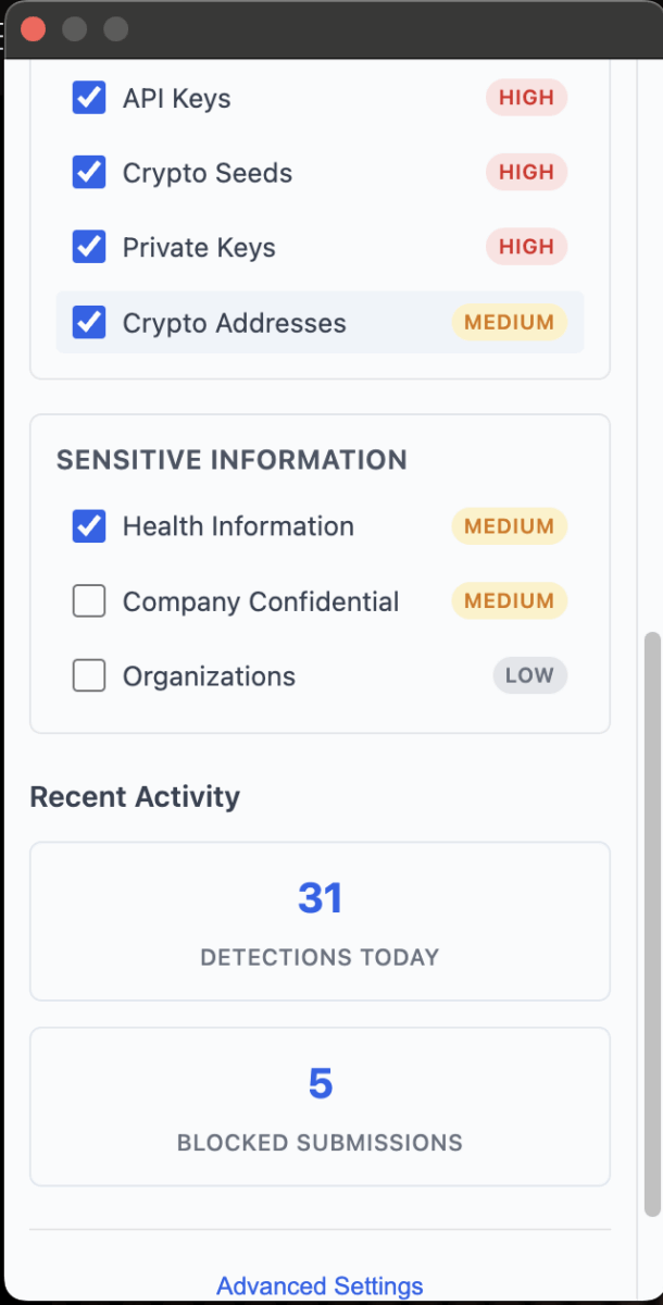 LeakAI works silently in the background, highlighting sensitive information as you type, so you can decide what to share—and what to keep private. No complicated setup, no expensive enterprise tools. Just smart, simple privacy.